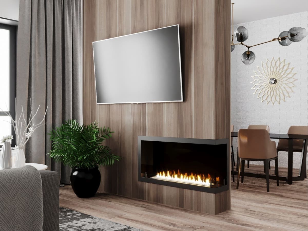 Декоративное стекло — крепится на всю заднюю стенку очага. За счет своего зеркального отражения, пламя визуально становится в 2 раза больше и кажется, что камин горит еще ярче.