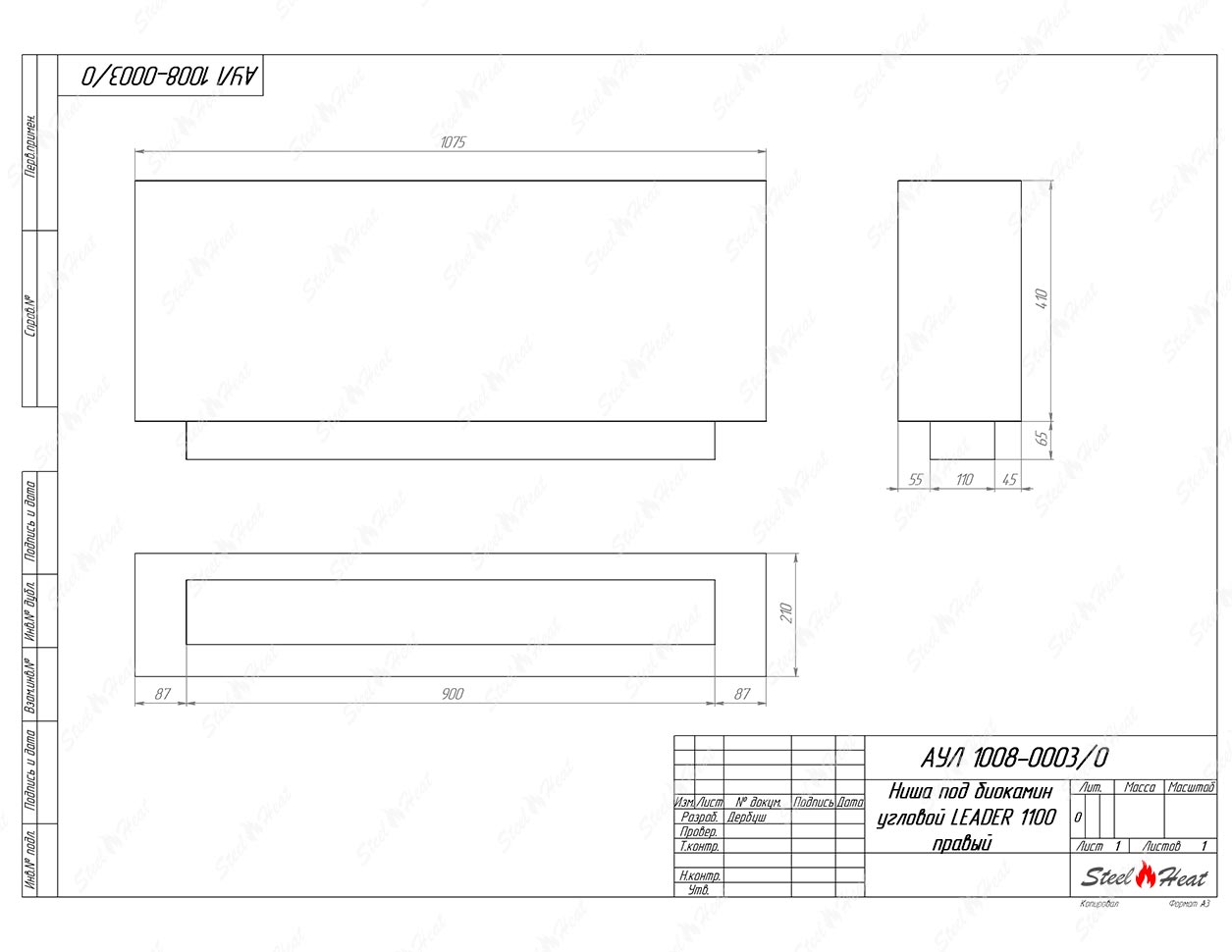 Встраиваемый Биокамин угловой SteelHeat Leader 1100 правый предназначен для встраивания в глухие ниши из гипсокартона, кирпича, пеноблоков, бетона.